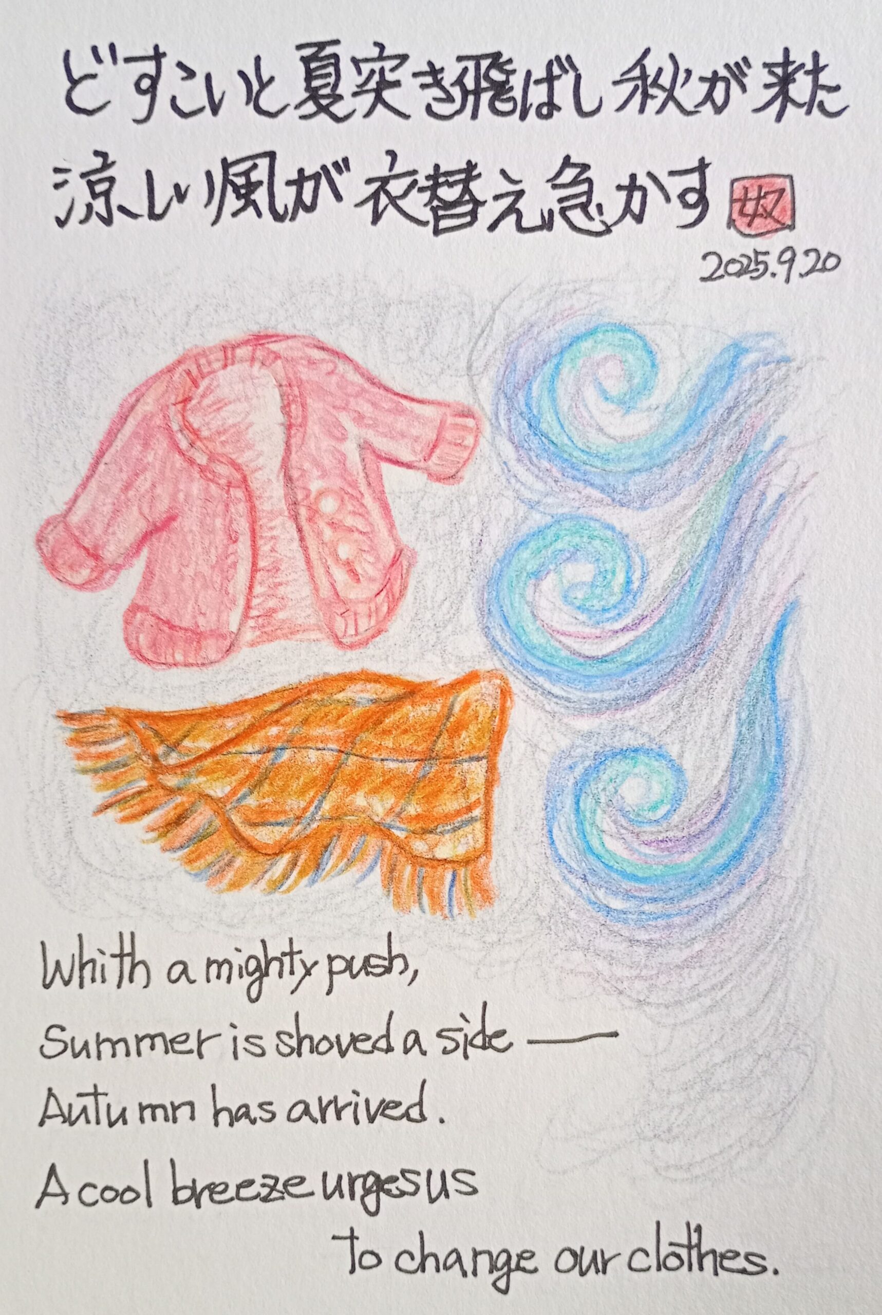 どすこいと 夏突き飛ばし 秋が来た 涼しい風が 衣替え急かす
