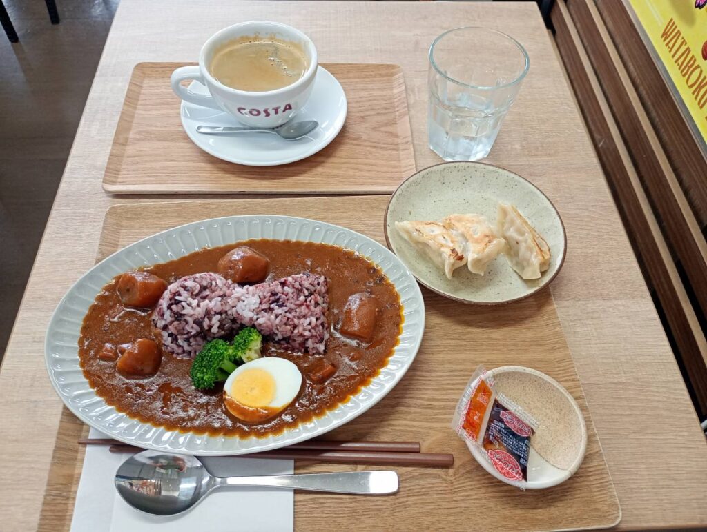 限定定食の古代米カレーがまだありましたので、早速頼んでみました。また、頑張って自転車を漕いだごほうびに、行田の餃子もプラスします。注文していると、どんどん欲が出て、アッフォガートも食べたかったのですが、そんな時間はありませんでした。食事した午後は、お店の中はそれなりに混んでいました。