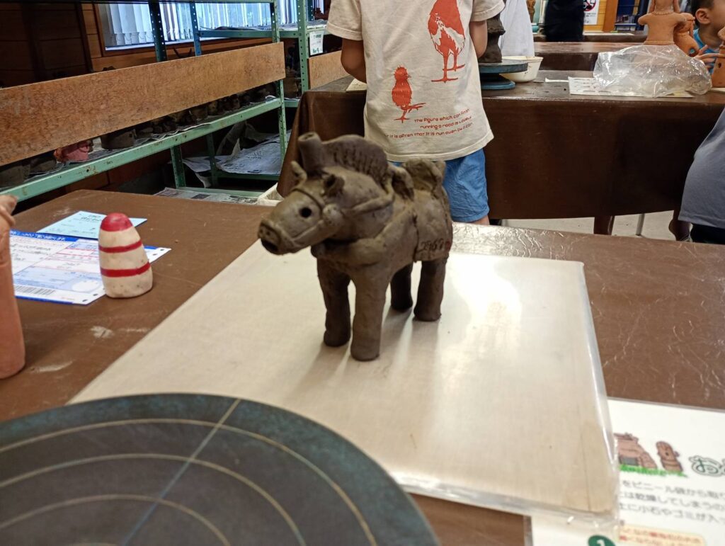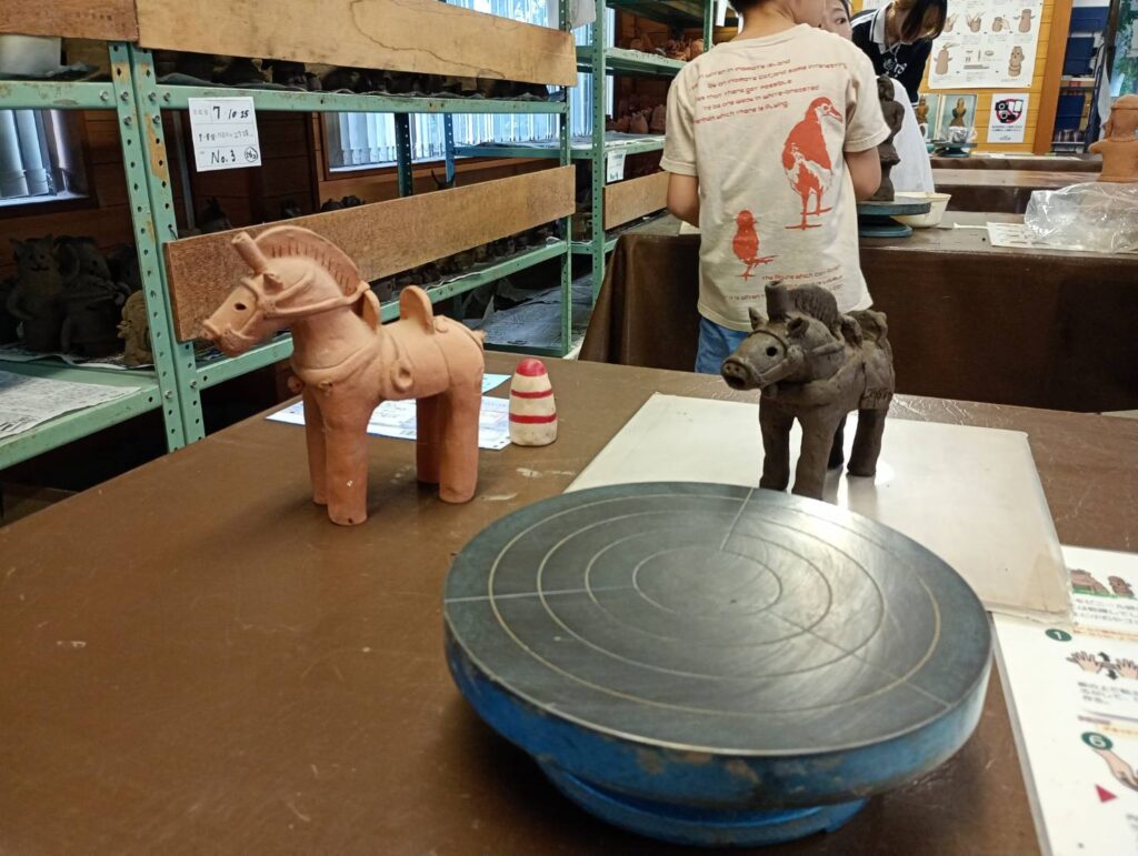 最初にスタッフさんからの説明があります。その時は、人物型の踊るはにわと壺型土器のサンプルしかなかったので、内心ガッカリしてしまいました。あきらめようとしたら、最後にスタッフさんが、室内にあるサンプルはにわであれば、それを参考に好きなものを作って良いですと、言ってくださいました。そこで、やっぱり馬にチャレンジしたい!と、馬はにわを選んでいると、スタッフさんが、気付いてくれて、改めて馬はにわの土台のモデルと、作り方の概要を説明してくださいました。