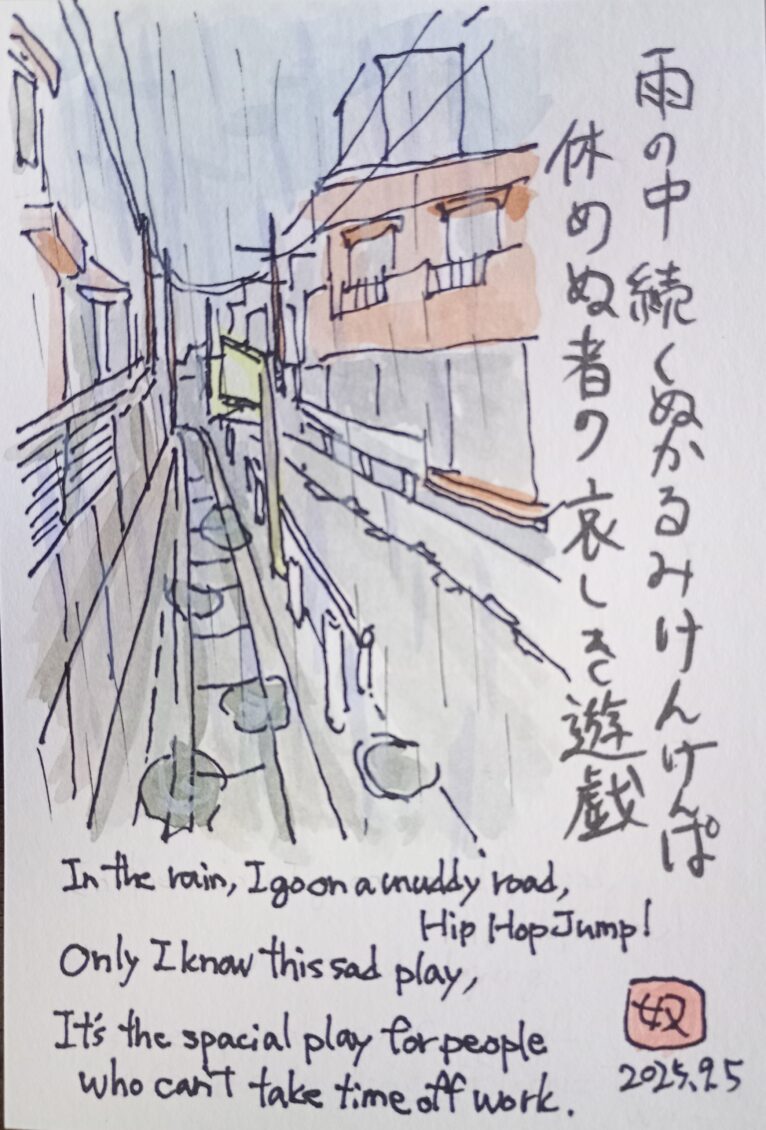 雨の中 続くぬかるみ けんけんぱ 休めぬ者の 哀しき遊戯